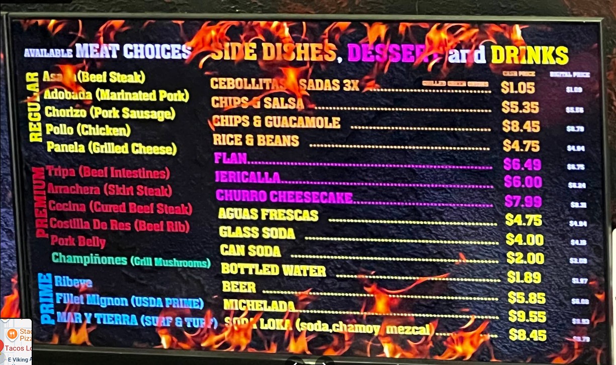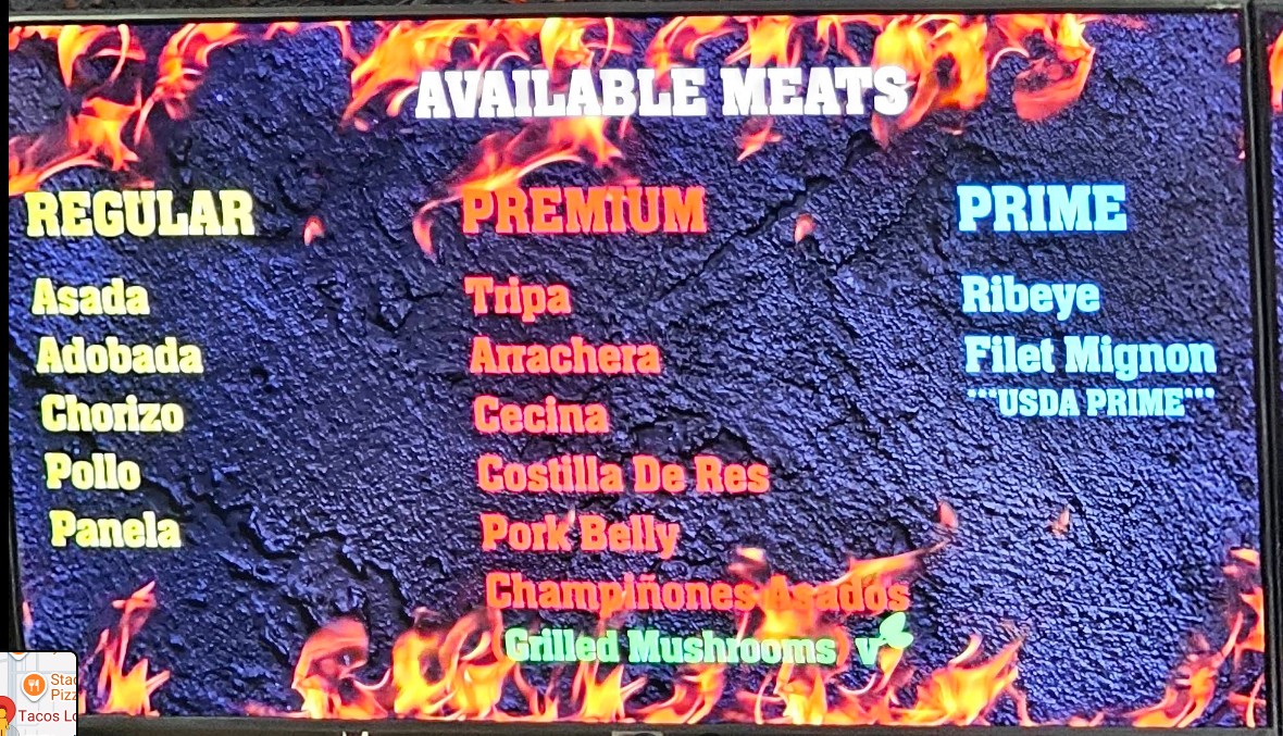 The food was enjoyable. The meats tasted good and everything was fresh. Extensive choices for salsa and toppings. They pile the meat on. No skimping. Mine they got wrong twice. They gave one chicken and one steak taco when I had ordered one chicken and two adobada tacos. It was made right fairly quickly and I got an extra taco out of it. They also forgot my soda until the server came and asked how everything was and I reminded her. Otherwise she did a good job. (No issues with my friend’s order.) Parking is a nightmare at peak times!!